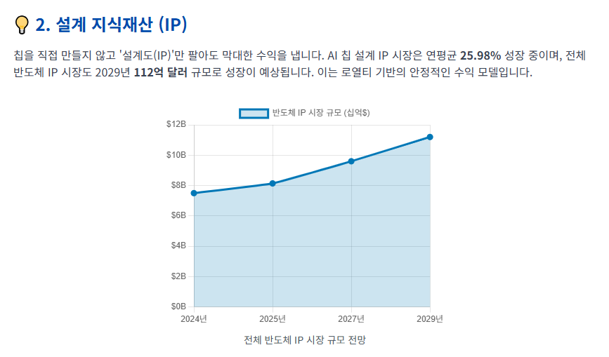 - **AI 반도체 설계자산 (IP):** 직접 칩을 만들지 않아도, 칩 설계의 핵심 기술(IP)을 파는 기업들이 새로운 수익을 창출합니다.