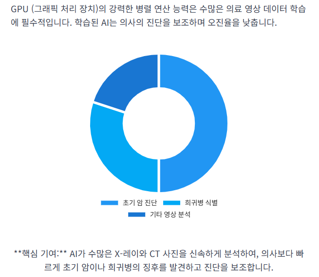 - AI 진단: GPU로 학습된 AI가 수많은 X-레이, CT 사진을 분석하여 의사보다 빠르게 초기 암이나 희귀병을 진단합니다.