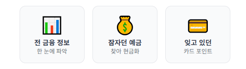 - 은행/금융투자회사 계좌 조회: 내가 가입한 모든 은행, 증권사 등의 계좌 목록을 한눈에 볼 수 있습니다.