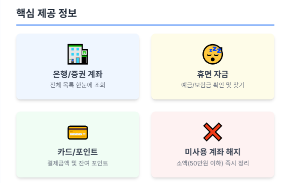 💡 주목: 이 서비스를 이용하면, 오랫동안 연락하지 않던 은행이나 증권사에 직접 방문할 필요 없이 온라인으로 모든 금융 현황을 파악할 수 있어 시간과 노력을 크게 절약할 수 있습니다.