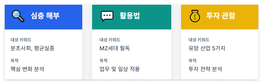 - 특정 키워드(예: 분초사회, 평균실종)에 대한 더 깊은 분석은 [트렌드 코리아 2026 핵심 변화 3가지 심층 해부 포스팅]에서 확인하실 수 있습니다.