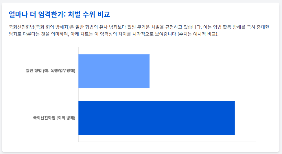 이 법은 국회 회의를 방해할 목적으로 폭행이나 감금 등을 할 경우 아주 엄격하게 처벌하도록 규정하고 있습니다. 일반 형법보다 형량이 무겁고, 일정 수준 이상의 형을 받으면 피선거권이 박탈(의원직 상실 및 출마 금지)되기 때문에 정치적 생명이 걸린 재판이었습니다.