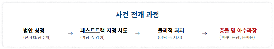 이 과정에서 '빠루(쇠지렛대)'가 등장하고 몸싸움이 벌어지면서 수많은 의원과 당직자가 고발되는 초유의 사태가 벌어졌습니다.
