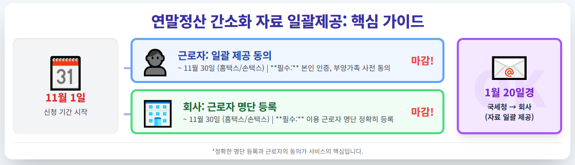 - **근로자 명단 등록:** 회사 담당자는 일괄제공 서비스를 이용할 근로자들의 명단을 11월 30일까지 등록해야 합니다.