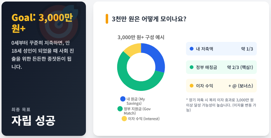 | 매칭 비율 | 아동이 월 5만 원 저축 시, 국가가 월 10만 원 지원 |