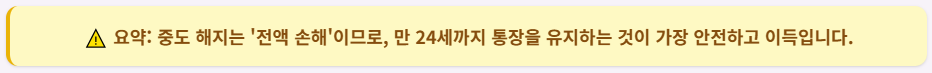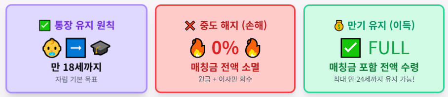 🚨 절대 손해 보지 마세요: 만약 만 18세 이후에도 자립 지원 목적으로 사용할 계획이 없다면, 만 24세까지 통장을 유지하여 자유롭게 사용할 수 있습니다. 중도 해지는 가장 피해야 할 선택입니다.