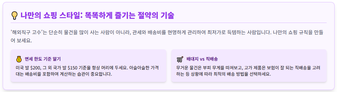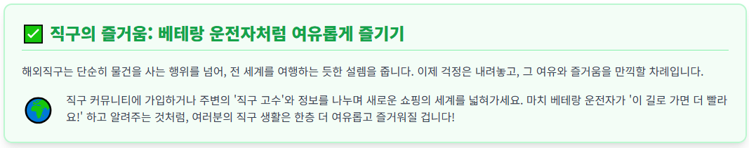 - 정보 탐색의 재미: 단순히 '어디에 무슨 물건이 싸다'를 넘어, 어떤 서비스가 더 편리한지, 어떤 통관 방식이 더 유리한지 등을 알아가는 과정 자체가 하나의 즐거운 공부가 될 수 있습니다.