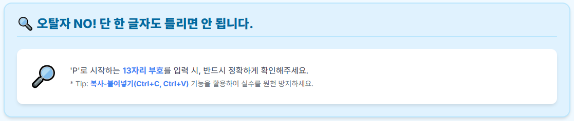 - 'P'로 시작하는 13자리 숫자를 입력할 때는 반드시 정확하게 확인해주세요. 한 글자라도 오타가 나면 세관에서 '이 번호는 없는 번호네?' 하고 통관을 멈추게 됩니다. 복사-붙여넣기(Ctrl+C, Ctrl+V) 기능을 활용하면 실수를 줄일 수 있어요.