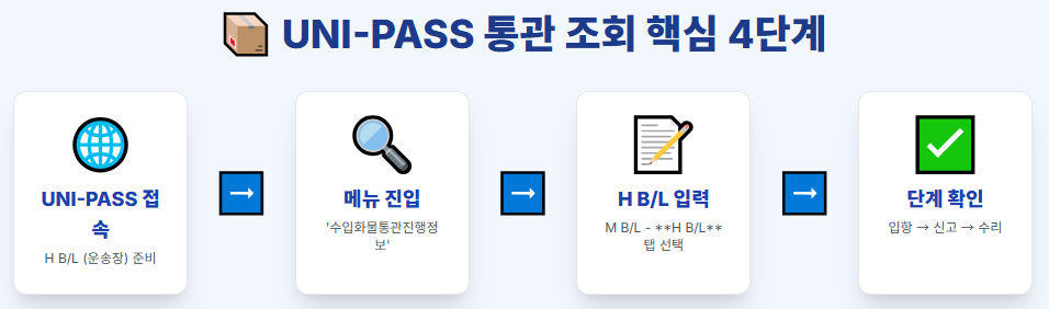 국민비서 알림을 설정했더라도, 통관이 지연되거나 상세한 정보를 확인하고 싶다면 **관세청 유니패스(UNI-PASS)**를 이용해야 합니다. **운송장 번호(H B/L)**만 있으면 조회할 수 있습니다.