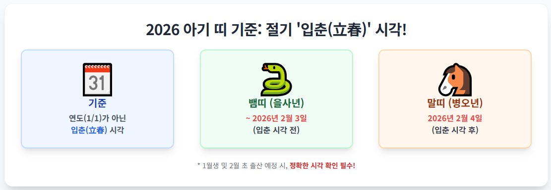 띠는 '연도'가 아니라 '절기'를 기준으로 하므로, 1월생이나 2월 초 출산 예정이신 분들은 이 기준을 꼭 확인하셔야 정확한 아이의 띠를 알 수 있습니다.