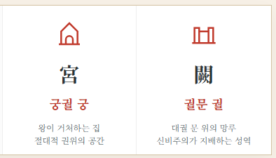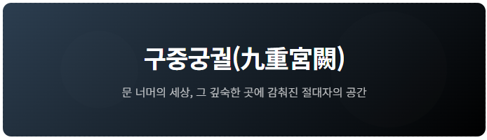 마지막으로 宮闕(궁궐)은 왕이 거처하는 '궁'과 대궐 문 위에 세워진 망루인 '궐'이 합쳐진 단어입니다. 즉, 구중궁궐은 물리적으로는 겹겹이 에워싸인 거대한 성곽 도시를, 상징적으로는 절대적인 권위와 신비주의가 지배하는 성역을 뜻합니다.
