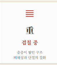 重(겹칠 중)은 층층이 쌓인 구조를 뜻합니다. 이는 공간의 폐쇄성을 강화하며, 내부로 진입할수록 외부 세계와의 연결이 기하급수적으로 차단됨을 암시합니다.