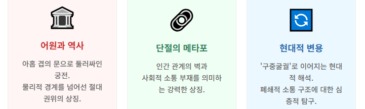 언어는 시대를 반영합니다. 최근 다시금 회자되는 '구중궁궐(九重宮闕)'이라는 단어는 단순한 건축적 의미를 넘어, 인간 관계와 사회적 소통의 단절을 상징하는 강력한 메타포로 자리 잡았습니다. 본 포스팅에서는 이 단어의 어원부터 역사적 배경, 그리고 현대적 변용인 '구중굴궐'의 의미까지 심층적으로 탐구합니다.