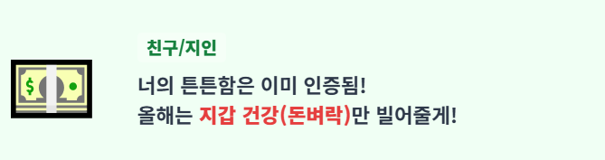 - "새해에도 건강? 걱정 마! 넌 원래 튼튼하잖아! 대신 지갑 건강은 내가 빌어줄게! 💵 돈벼락 맞아라! 새해 복 많이!"