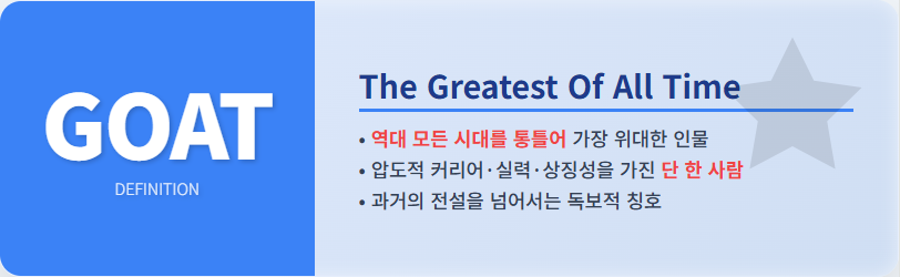 이 용어는 단순히 실력이 뛰어난 선수를 지칭하는 단어가 아닙니다. 동시대의 경쟁자들은 물론, 과거의 전설적인 인물들과 비교해도 압도적인 커리어와 실력, 상징성을 가진 단 한 사람에게만 허락되는 칭호입니다.