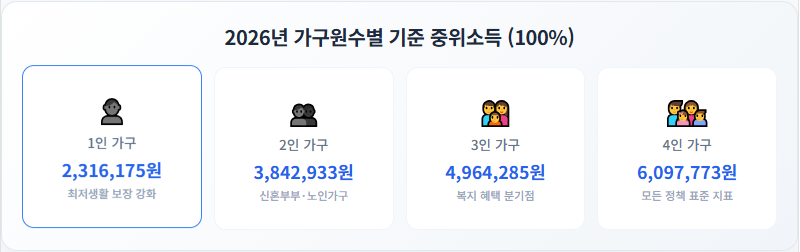 보건복지부가 발표한 2026년도 공식 데이터입니다. 자신의 가구원 수에 맞는 기준을 확인해 보세요.