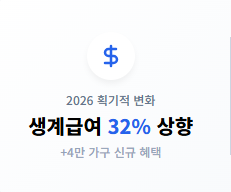 가장 주목해야 할 점은 **생계급여의 선정 기준이 중위소득 31%에서 32%로 상향**되었다는 사실입니다. 이는 단순한 1%의 수치 변화가 아니라, 약 4만 가구 이상의 국민이 새로 수급 혜택을 받을 수 있게 됨을 의미합니다.