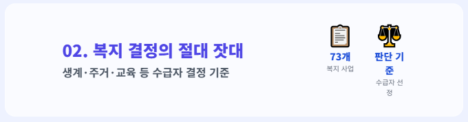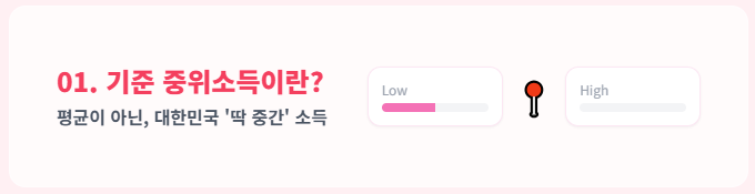 기준 중위소득은 단순히 '평균 소득'을 의미하는 것이 아닙니다. 대한민국 전체 가구를 소득 순으로 나열했을 때 딱 중간에 있는 가구의 소득을 뜻하며, 현재 생계급여, 주거급여, 교육급여 등 **총 73개 복지 사업**의 수급자를 결정하는 절대적인 잣대입니다.