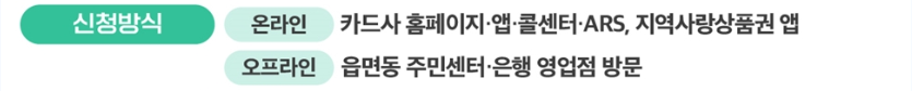 - 주거래 카드사 홈페이지 또는 앱: KB국민, NH농협, 롯데, 삼성, 신한, 우리, 하나, 현대, BC카드 등 9개 카드사의 홈페이지, 앱, 콜센터, ARS를 통해 신청 가능합니다. (본인이 주로 사용하는 카드를 통해 신청)