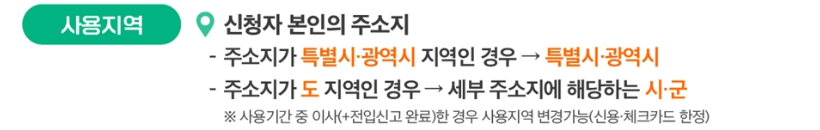 - 사용처: 대형마트, 백화점, 온라인 쇼핑몰, 유흥업소 등 일부를 제외하고, 주소지 지역 내의 식당, 마트, 학원, 병원, 미용실 등 대부분의 소상공인 사업장에서 사용 가능합니다. 결제 전에 가맹점 여부를 확인하는 것이 좋습니다.