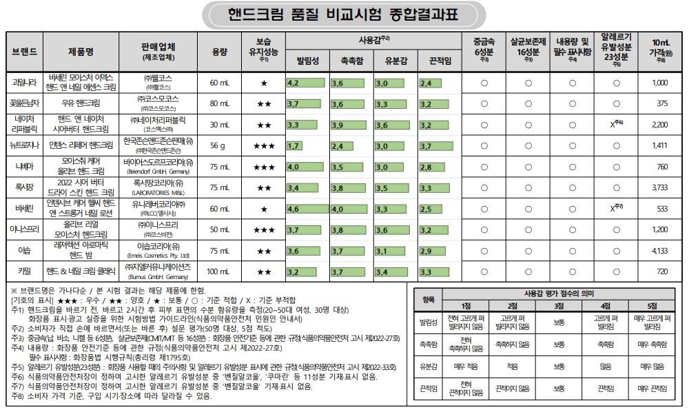 겨울철은 손이 쉽게 건조해지는 계절로, 핸드크림의 필요성이 더욱 커집니다. 한국소비자원이 여러 브랜드의 핸드크림에 대한 비교시험을 실시하였는데, 여기서 그 시험결과를 근거로 핸드크림추천 제품들을 정리 알려드리겠습니다.
