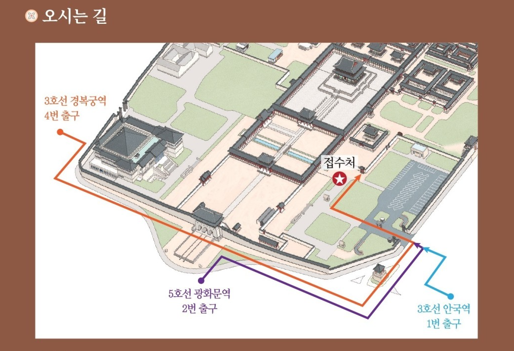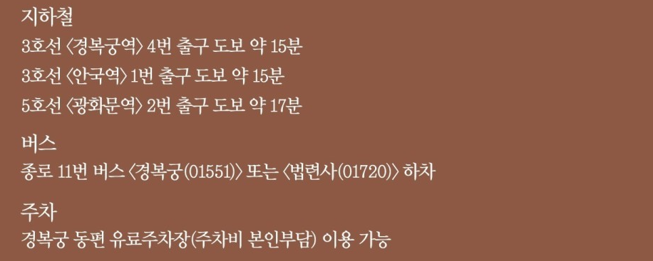 - 대중교통: 지하철 3호선 경복궁역 5번 출구로 나와 도보로 이동.