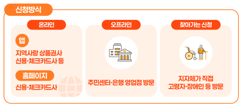 - **오프라인 신청**: 신청 기간 중 평일 오전 9시부터 오후 6시까지(은행 영업점은 오후 4시까지) 가능합니다. 카드와 연계된 은행 영업점을 방문하거나 읍면동 행정복지센터에서 신청할 수 있습니다.
