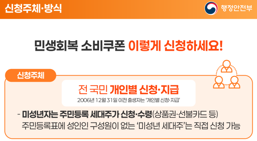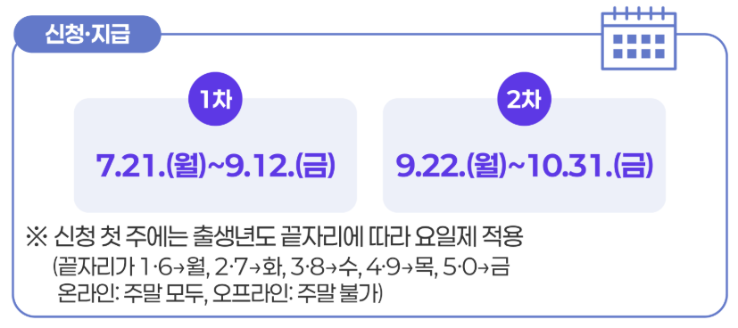 신청은 2025년 7월 21일 오전 9시부터 9월 12일 오후 6시까지 온·오프라인으로 가능합니다. 2006년 12월 31일 이전에 출생한 성인은 개인별로 신청하여 지급받을 수 있습니다.