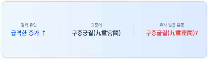 최근 검색량 지표를 살펴보면 '구중굴궐'이라는 단어의 유입이 눈에 띄게 증가했습니다. 사실 표준어상으로는 '구중궁궐(九重宮闕)'이 올바른 표기입니다.