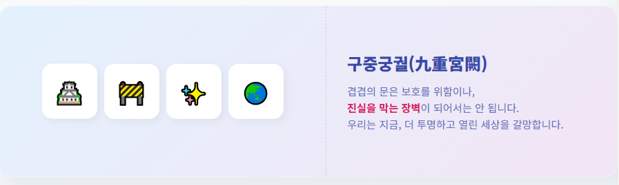 오늘 우리는 구중궁궐(구중굴궐)이라는 단어를 통해 역사와 소통의 가치를 되새겨 보았습니다. 겹겹이 쌓인 문은 보호를 위한 것이지만, 그 문이 진실을 막는 장벽이 되어서는 안 될 것입니다. 우리가 이 고사성어를 다시금 꺼내 드는 이유는, 아마도 더 투명하고 열린 세상을 향한 갈망 때문이 아닐까요?