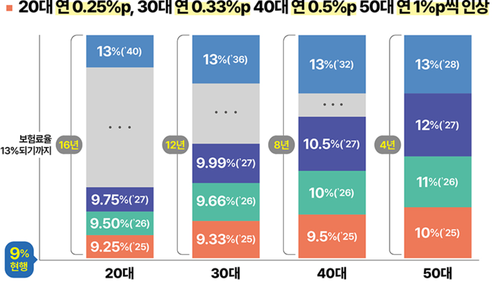 특히, 20대부터 50대까지 세대별로 인상 속도가 다르게 설정되어, 각 세대의 잔여 납입 기간에 따라 차등적으로 적용될 계획입니다.