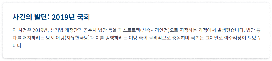 이 사건은 지난 2019년, 선거법 개정안과 공수처 법안 등을 패스트트랙(신속처리안건)으로 지정하는 과정에서 발생했습니다.