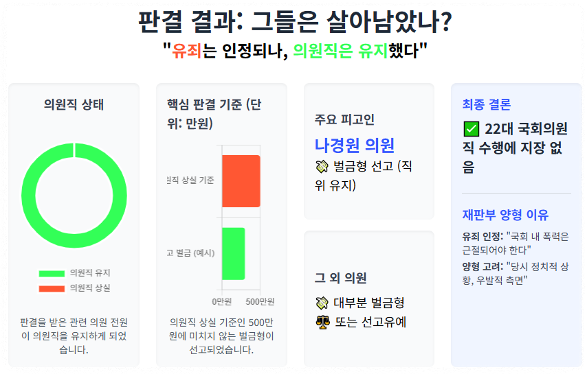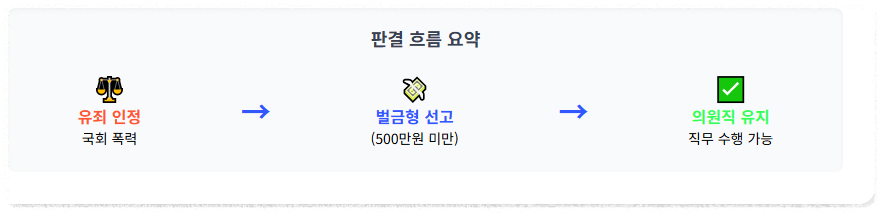 재판부는 "국회 내 폭력은 근절되어야 한다"며 유죄를 인정하면서도, 당시의 정치적 상황과 우발적인 측면을 고려해 양형을 정한 것으로 보입니다.
