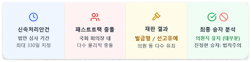 이 법은 국회 회의를 방해할 목적으로 폭행이나 감금 등을 할 경우 아주 엄격하게 처벌하도록 규정하고 있습니다. 일반 형법보다 형량이 무겁고, 일정 수준 이상의 형을 받으면 피선거권이 박탈(의원직 상실 및 출마 금지)되기 때문에 정치적 생명이 걸린 재판이었습니다.