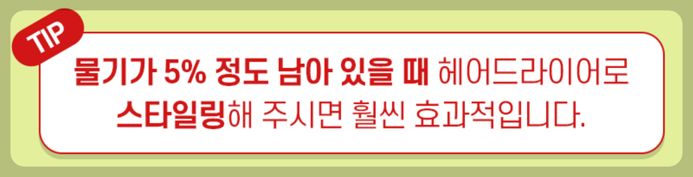 물기가 5% 정도 남아 있을 때 허어드라이어로 스타일링해주면서 말리세요.