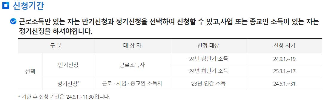 반기신청은 매년 6월과 12월에 이루어지며, 해당 기간의 소득을 기준으로 신청합니다. 반기신청은 정기신청보다 간소화된 절차로 진행되며, 금액은 다음과 같습니다.