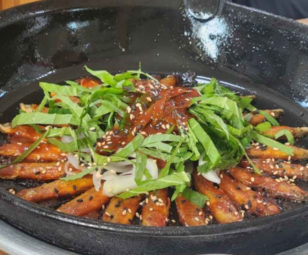 어죽과 함께 저곡식당의 대표 메뉴인 도리뱅뱅이는 그 바삭함이 일품입니다. 얇게 튀겨낸 민물고기들이 둥글게 뱅뱅 둘러 담겨 나오는 모습부터 시각적인 즐거움을 선사합니다. 한입 베어 물면 섬세한 바삭함이 입안 가득 퍼지며, 민물고기 특유의 고소함과 매콤달콤한 양념이 어우러져 깊은 감칠맛을 자아냅니다. 이 바삭한 유혹은 단순히 맛있는 요리를 넘어, 뒤이어 나올 어죽의 풍미를 극대화하기 위한 완벽한 서곡과도 같습니다. 깻잎이나 아삭한 양파와 함께 곁들이면 더욱 다채로운 식감과 향의 조화를 경험할 수 있어, 미식의 즐거움을 한층 더 끌어올려 줍니다.