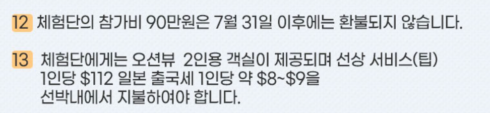 7박 8일간의 크루즈 여행이 240만 원 상당인데, 체험단으로 선정되면 1인당 90만 원의 경비만 부담하시면 됩니다. 이 비용에는 승선비용 일부와 기항지 관광비용이 포함되어 있습니다. 나머지 비용은 해양수산부에서 지원하는 셈이죠. 이런 파격적인 가격으로 대형 크루즈 여행을 즐길 수 있는 기회는 흔치 않습니다. 저렴한 비용으로 럭셔리한 경험을 할 수 있는 절호의 찬스입니다!