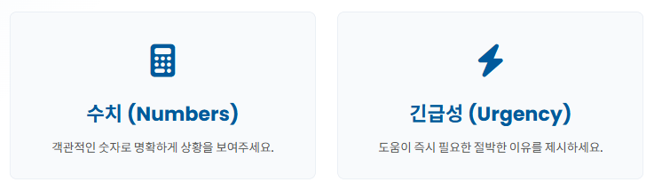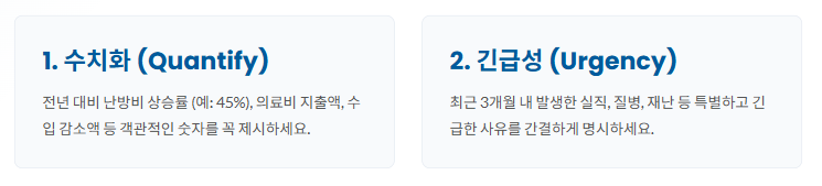 - **긴급성:** 최근 3개월 내 발생한 실직, 질병, 재난 등 특별한 사유를 간결하게 명시하세요.