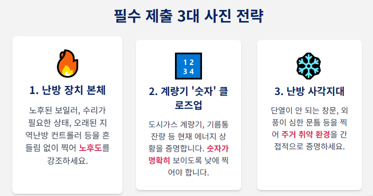 난방비 지원은 '에너지 취약성'을 증명하는 것이 핵심입니다. 심사관들은 서류보다 **사진**을 통해 당신의 긴급성을 빠르게 파악합니다. 다음 세 가지 사진은 **필수이자 전략**입니다.