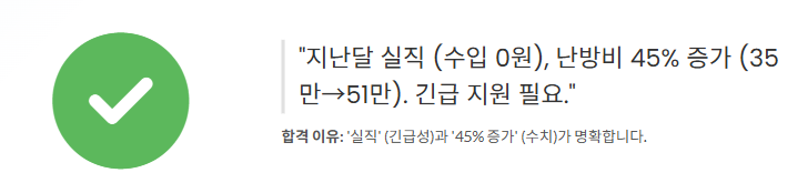 ⭕️ 좋은 예시: "지난달 실직으로 수입 0원 발생, 난방비가 전년 대비 45% 증가(35만원→51만원)하여 긴급 지원이 필요합니다."