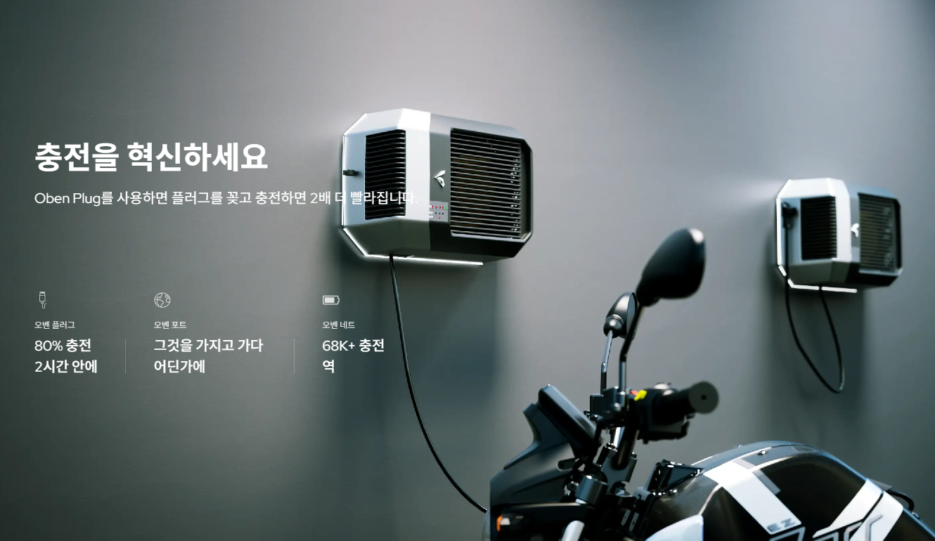충전 편의성 또한 놓치지 않았습니다. '오벤 플러그(Oben Plug)'를 통해 단 2시간 이내에 배터리를 0%에서 80%까지 충전할 수 있습니다.
