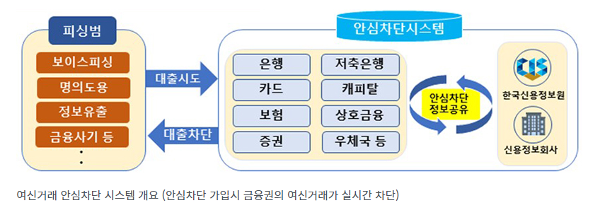 여신거래 안심차단 서비스는 이용자가 본인이 원하지 않는 신규 여신거래(신용대출, 카드론, 신용카드 발급 등)를 사전에 차단할 수 있도록 하는 시스템입니다. 이를 통해 보이스피싱, 명의도용 등으로 인한 불법 대출 피해를 예방할 수 있습니다.