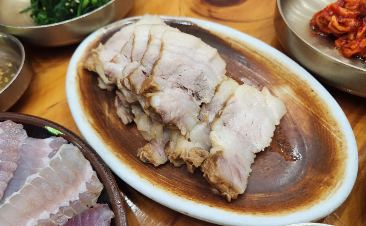 드디어 기다리고 기다리던 홍어삼합이 나왔습니다! 삭힌 홍어와 부드러운 돼지고기 수육, 그리고 아삭한 김치의 조합이 정말 인상적이었어요. 처음에는 살짝 머뭇했지만, 용기를 내어 한 점 입에 넣어보니... 와! 특유의 알싸한 맛과 향이 코끝을 찡하게 자극하더군요. 분명 강렬한 맛이지만, 돼지고기와 김치가 그 맛을 부드럽게 감싸주는 느낌이었습니다. 왜 호불호가 갈리는지 알 것 같으면서도, 이 맛에 빠지면 헤어 나오기 어렵겠다는 생각이 들었습니다. 혹시 처음이시라면 저처럼 작은 점부터 도전해 보시는 것을 추천합니다!