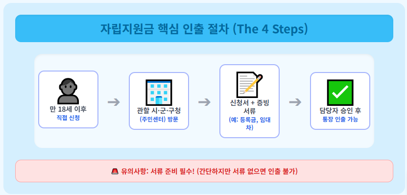자립지원금을 인출하려면 만 18세 이후 아동이 직접 신청해야 합니다. 절차는 비교적 간단하지만, 서류 준비가 필수입니다.