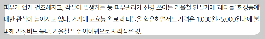 레티놀 제품은 간편하게 사용할 수 있는 형태로, 가성비 좋은 피부탄력 유지 제품으로 알려져 있습니다.