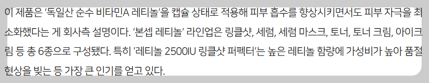 레티놀 제품은 여러 가지 종류가 있습니다. 예를 들어, 본셉 레티놀 세럼은 식물성 레티놀을 함유하고 있어 피부에 자극을 최소화하면서도 탄력 개선에 도움을 줍니다.