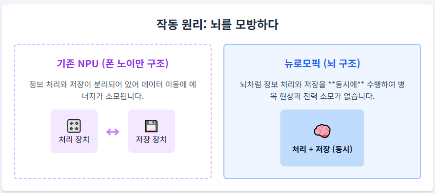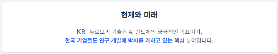 특징: 뉴로모픽 칩은 뇌처럼 정보 처리와 저장을 동시에 수행하여, 현재 NPU보다도 훨씬 **적은 에너지**로 복잡한 AI 작업을 수행할 수 있습니다. 이는 한국 기업들도 연구 개발에 박차를 가하고 있는 분야입니다.