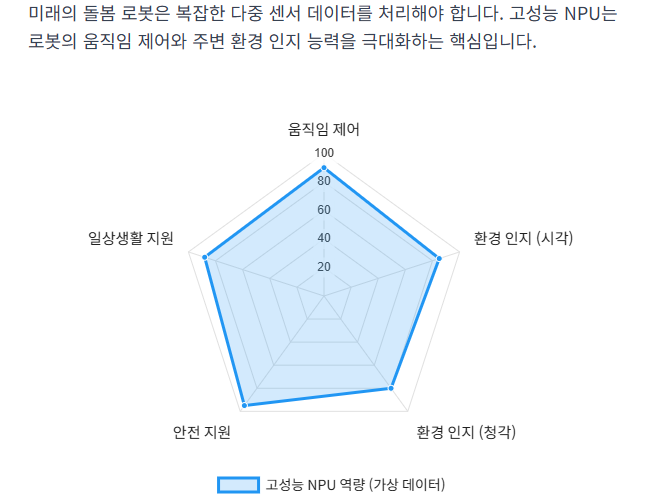 - 돌봄 로봇: 로봇의 움직임과 주변 환경 인지(시각, 청각 처리)는 **고성능 NPU**에 의해 구동되어, 노인 세대의 안전과 일상생활을 지원하게 됩니다.