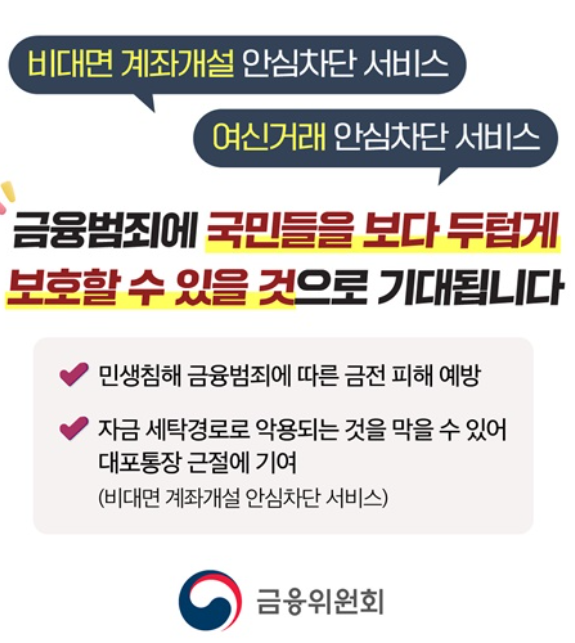 - 나도 모르는 사이 대포 통장 명의가 되는 것을 방지: 개인정보가 유출되었을 경우, 범죄자들이 이를 이용해 비대면으로 계좌를 개설하고 금융 범죄에 악용할 수 있습니다. 안심차단은 이러한 명의 도용 위험을 근본적으로 차단해 줍니다.